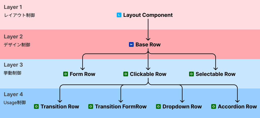 その上で、Row全体のデザインを制御する、挙動のないMolecule Component「Base Row」を定義しました。その上に、具体的な挙動を加え、それぞれの役割に応じたOrganism Componentを構築しています。